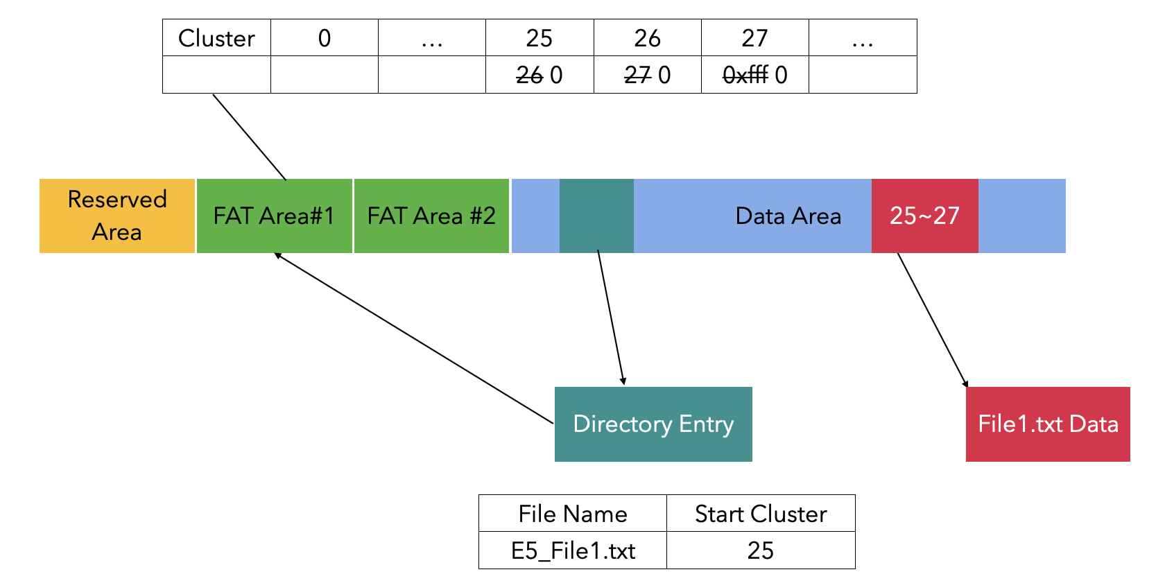 사용자가 파일을 삭제하면, 해당 파일의 디렉터리 엔트리에서 파일 이름의 첫 글자가 특수한 값(예: E5h)으로 바뀝니다.