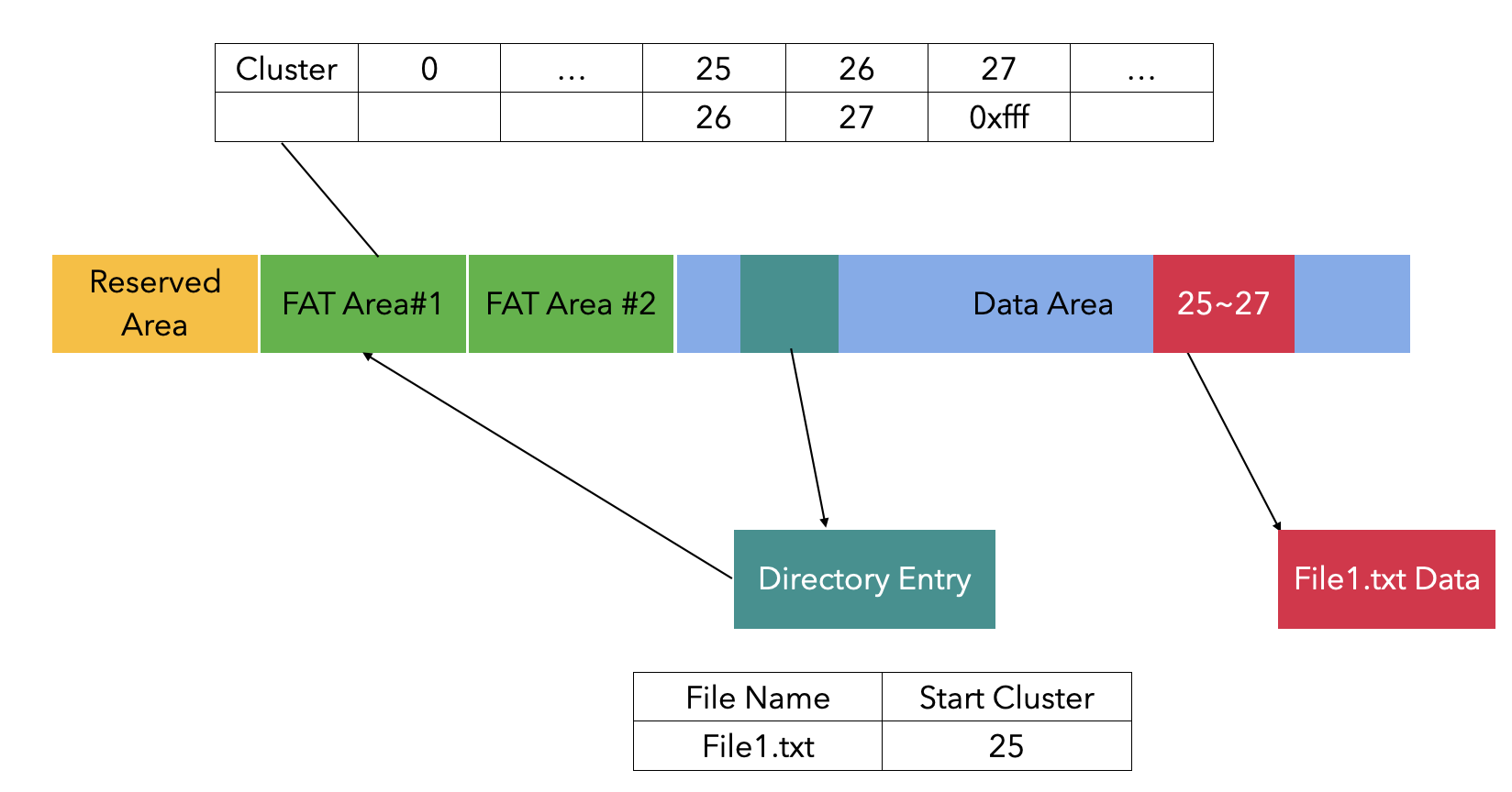 먼저, 파일의 이름, 크기, 생성 시간, 그리고 파일 데이터가 시작될 첫 번째 클러스터 번호 등의 정보가 디렉터리 엔트리(Directory Entry)에 기록됩니다. (루트 디렉터리 영역 또는 데이터 영역의 특정 위치)