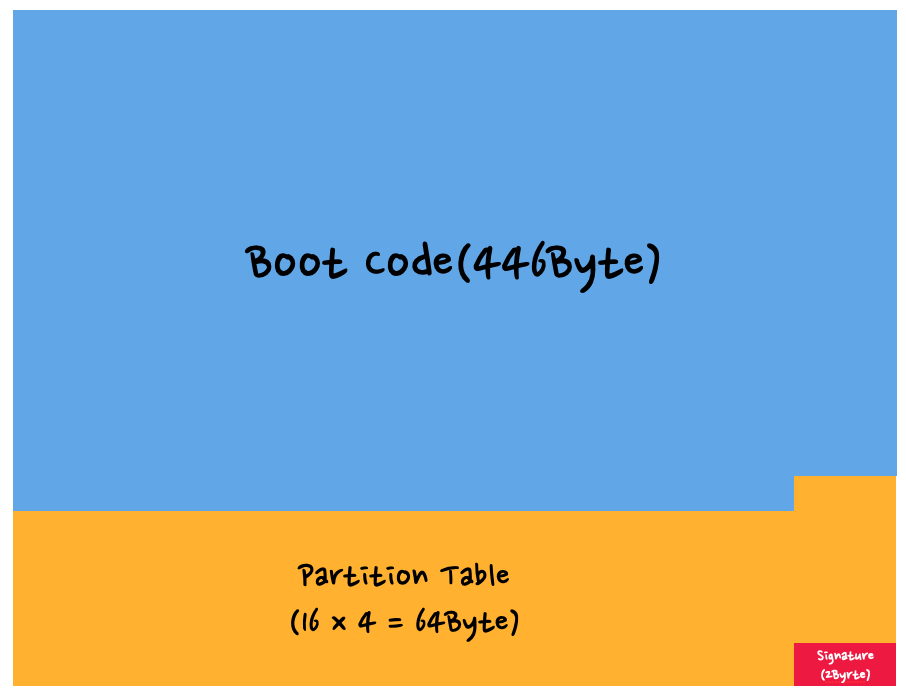 MBR은 총 512Byte의 크기로 구성됨. 부트코드(446Byte), 파티션테이블(64Byte), 시그니처(2Byte)로 구성되어 있음