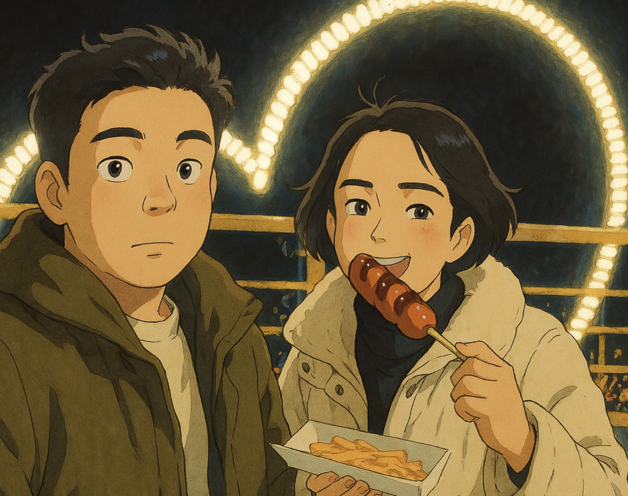 "지브리 캐릭터들은 눈이 크고 둥글둥글 부드러운 선으로 그려지네. 배경은 아련한 수채화 느낌이야.